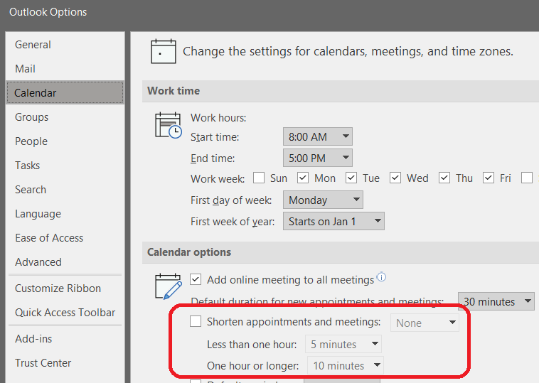 • Then set the settings for shorten meeting – ShortenEventScopeDefault, DefaultMinutesToReduceShortEventsBy, DefaultMinutesToReduceLongEventsBy