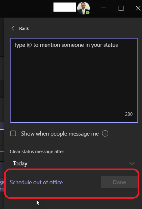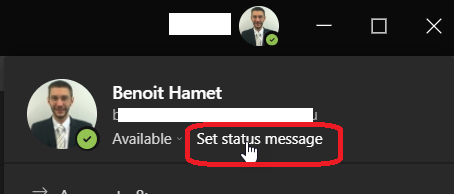 To do that, open the option menu by clicking on your picture and access the Set status message option