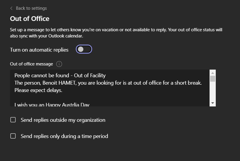 As you know, Out of Office has been a very valuable feature on mail systems (Exchange or Lotus Notes) to let senders you are away from the office for some time.