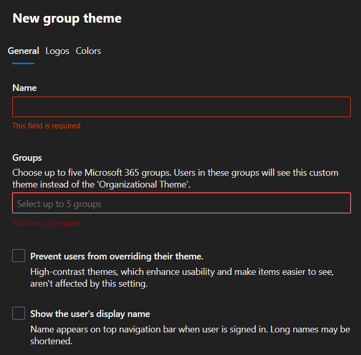 You will then define the name of the theme, the Office 365 groups to apply to (up to 5) and the other known theme options like allow user to override, the color scheme and logo
