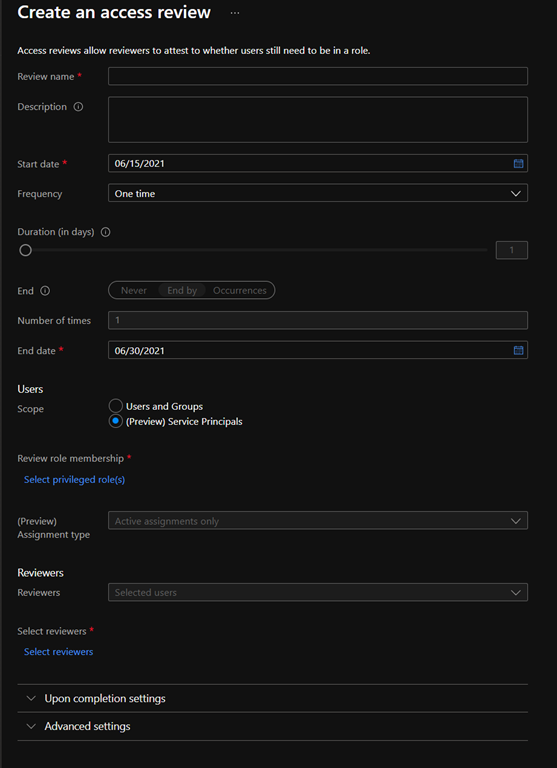 To take advantage of this new review capability, logon to your Azure AD portal (https://aad.portal.azure.com/) and access the Identity Governance\Azure AD Roles\Azure AD Roles\Access reviews to create a new review and select Service Principals as the scope of the review