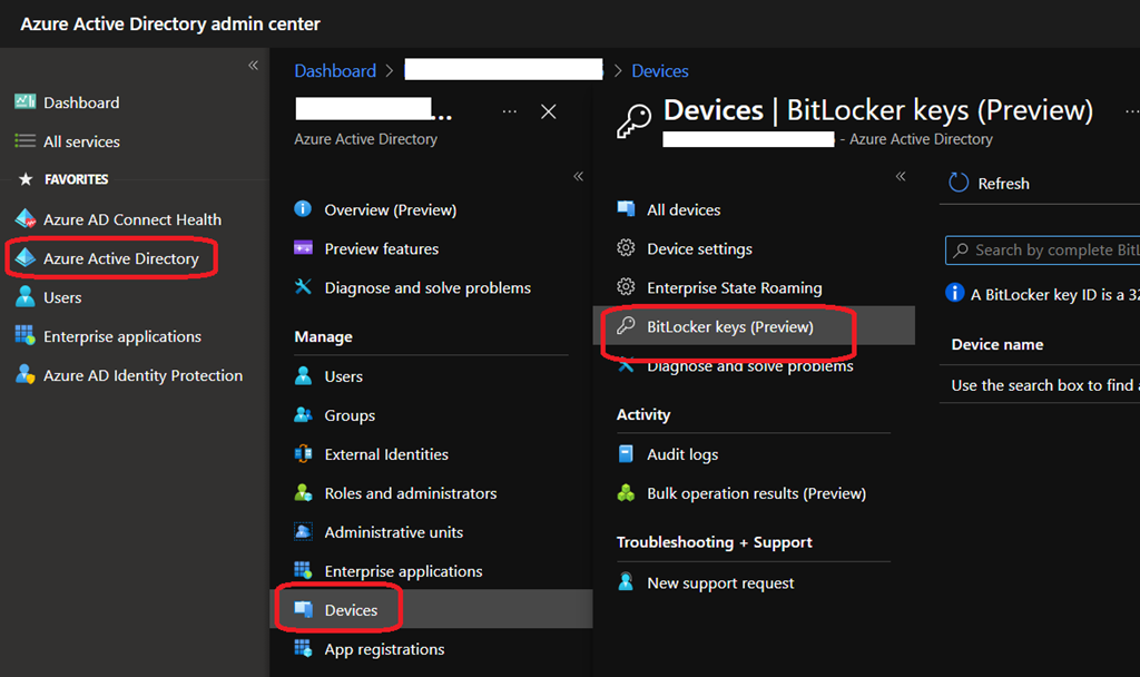 To search using the BitLocker Key ID, logon to your Azure AD portal (https://aad.portal.azure.com/) and access the Azure Active Directory\Devices\BitLocker keys blade