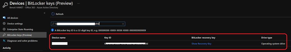 There enter the BitLocker Key ID shown on the recovery screen, if the recovery key has been saved in AAD you will get the device name, the key ID, the option to get the recovery key and the drive(s) encrypted with BitLocker
