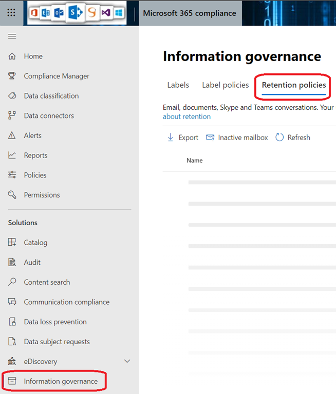 To apply a retention policy on Yammer, connect to your Compliance portal (https://compliance.microsoft.com/) to access the Information Governance blade and then the Retention Policies tab
