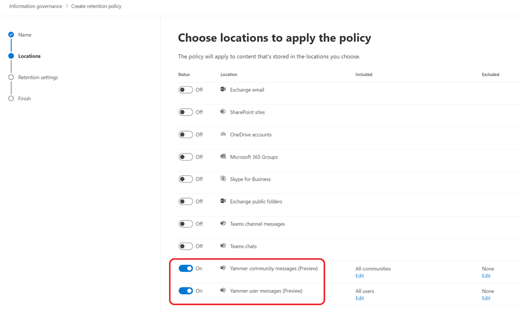 If you already have retention policies, you can not edit them to add the Yammer location.