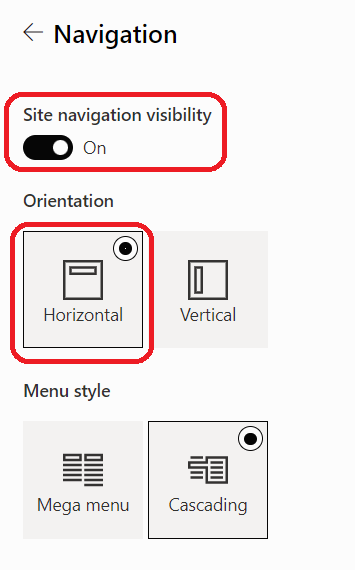 Then access the Navigation option and turn on the Site navigation visibility (if not yet turned on) and select the Horizontal setting