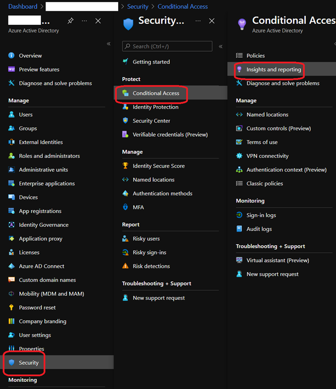 Once done, you connect to your Azure AD administration portal (https://aad.portal.azure.com/) and then access the Security\Conditional Access\Insights and reporting blade to access the insights and reports