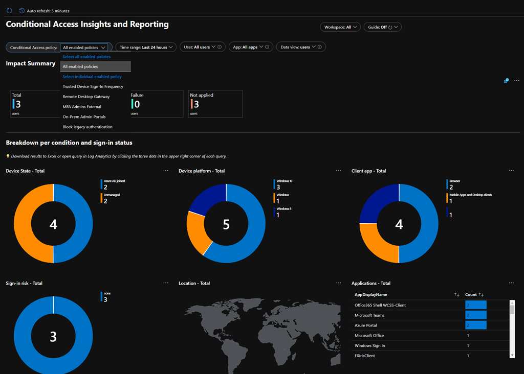 The default insights covers all conditional access policies you have enabled (either turned on or report only) for all user accessing all applications over the past 24 hours; off course you can change any of this settings to review one (or more) specific policy or application