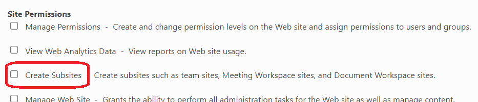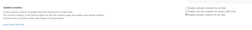 Finally scroll down to the Subsite Creation section to manage subsite creation; you can choose to block creation of modern subsite or all type of subsite (modern and classic)
