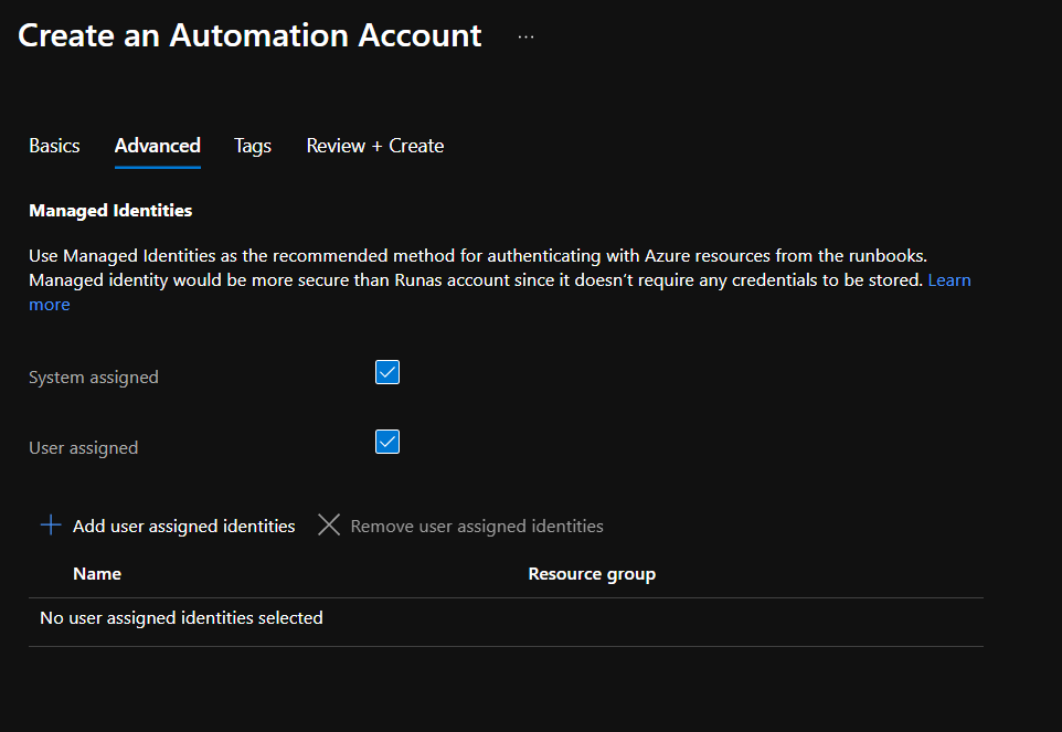 For existing Automation Account, you can convert from RunAs account to Managed Identity by accessing the Identity blade