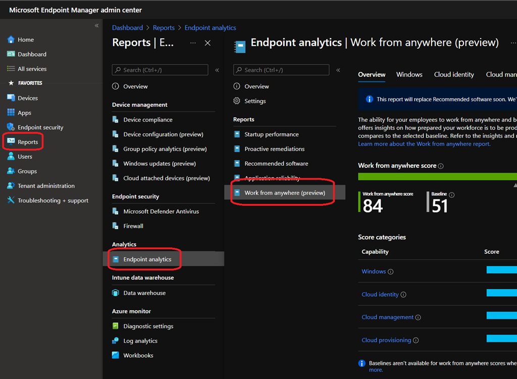 Replacement of Desktop Analytics is the new ‘Work from anywhere’ report available in Intune (Reports\Endpoint Analytics blade)