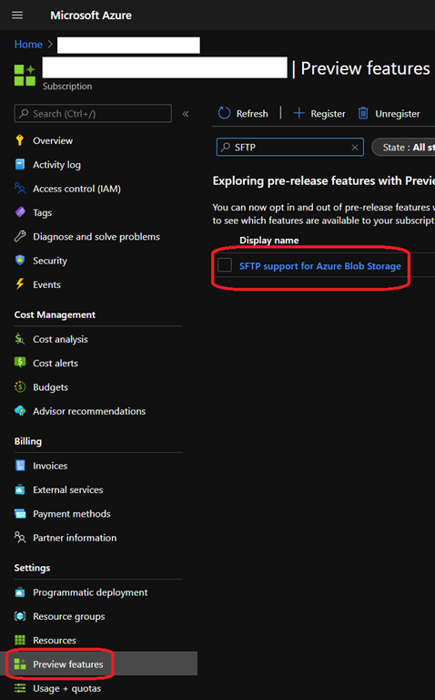 First thing first, you need to register the SFTP support for Azure Blob Storage provider by accessing the Preview features blade from your subscription