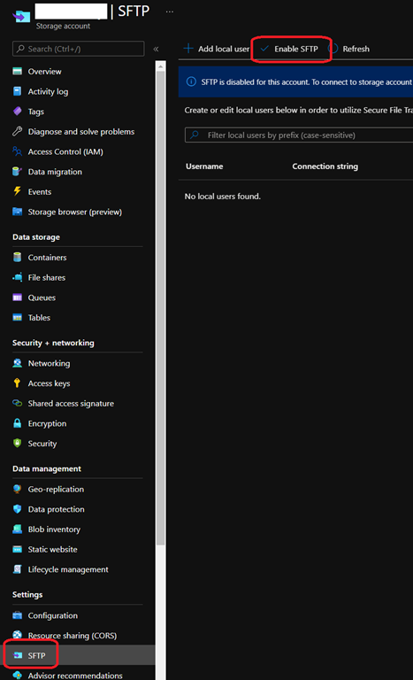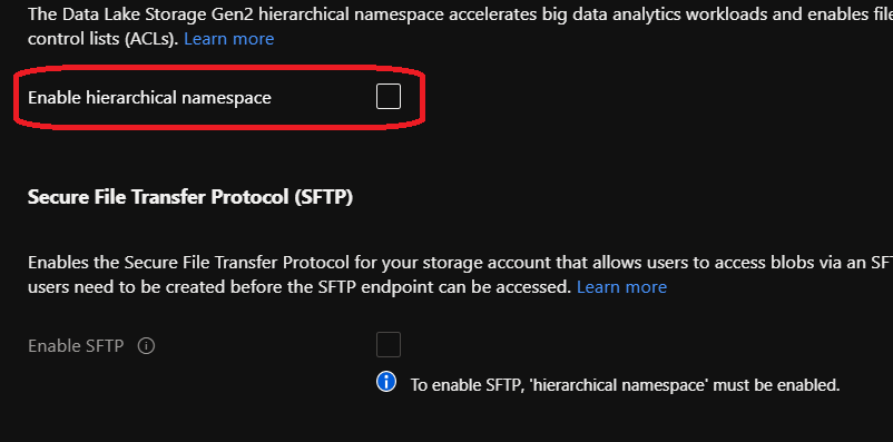 If you already have a storage account hosted in one of the supported region which already has the hierarchical namespace enabled you can enable SFTP on this existing account by accessing the SFTP blade under the Settings and use the Enable SFTP button