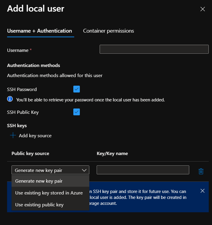 If you choose to enable SSH Key, you can either let Azure to generate a new key pair or use existing key.