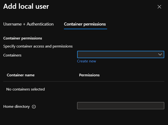 Then you define the user permission on the container; if you don’t have yet a container created you can create one from there too.