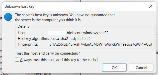 That’s it, you are ready to use your Azure Blob storage as FTP (sorry SFTP) using your favourite SFTP client; you may be prompted to trust the remote host as the host key is not known yet