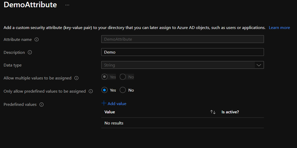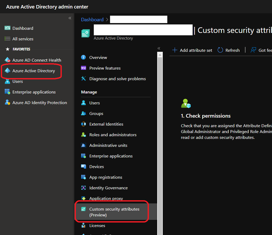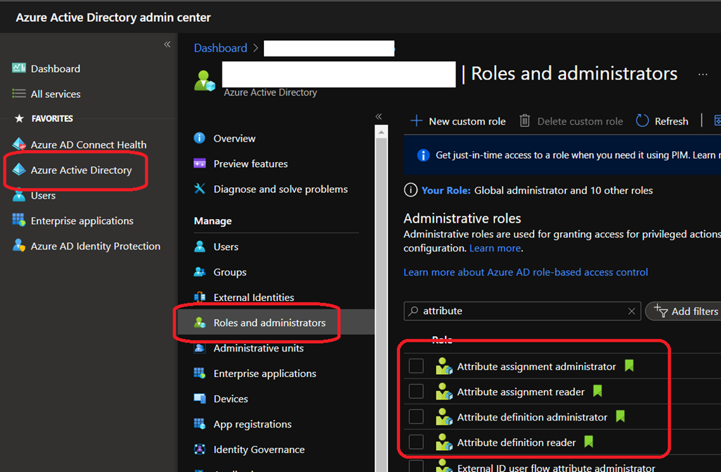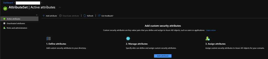 - You need to have the Attribute definition administrator to create attribute sets – Global Administrator and Privileged Role Administrator roles do not have permission to add or read custom security attributes