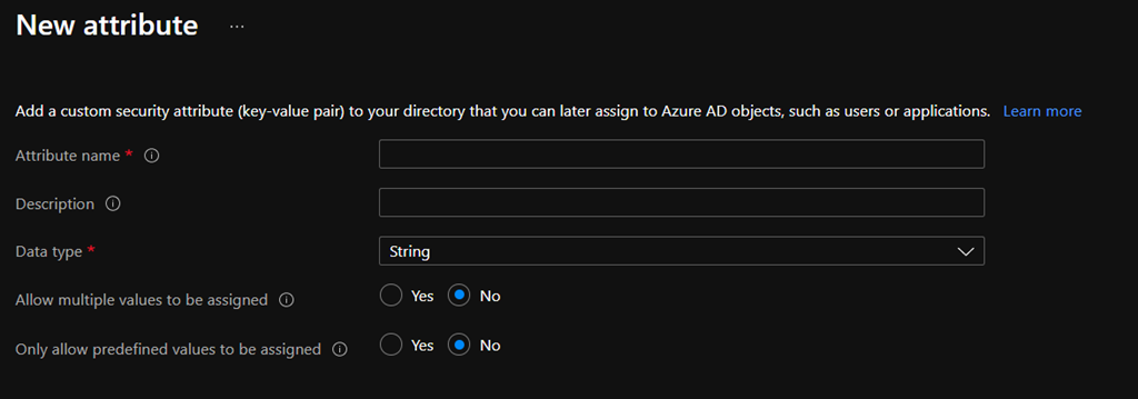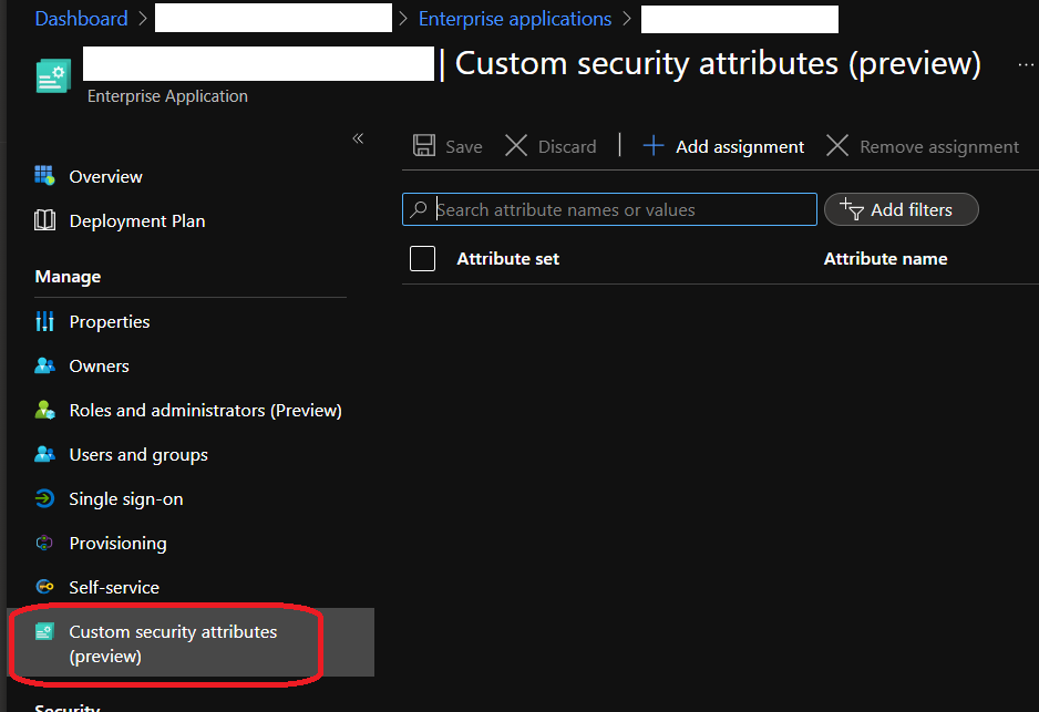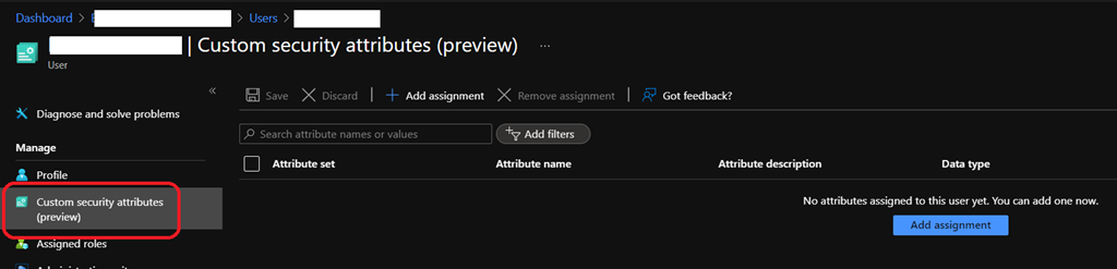 Then you can assign the attribute set to a supported object in Azure AD by accessing the Custom security attributes blade on the corresponding object