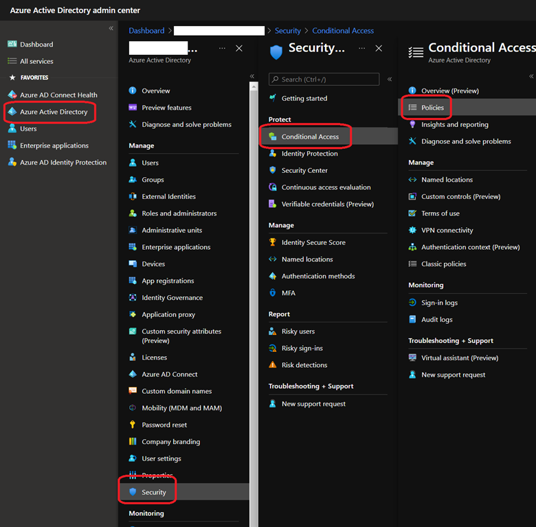 To configure Conditional Access for your workloads identities, connect to your Azure AD portal (https://aad.portal.azure.com/) and access the Azure Active Directory\Security\Conditional Access\Policies blade