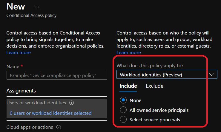 The Conditional Access feature has been evolving a lot over the past few years and policies apply to either users/groups or devices. Now a new feature (in preview) is available to let you apply Conditional Access policies to workloads identities too.