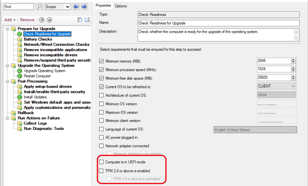 The updated task sequence now has the option to check for the TPM 2.0 chipset which is a requirement for Windows 11 deployment