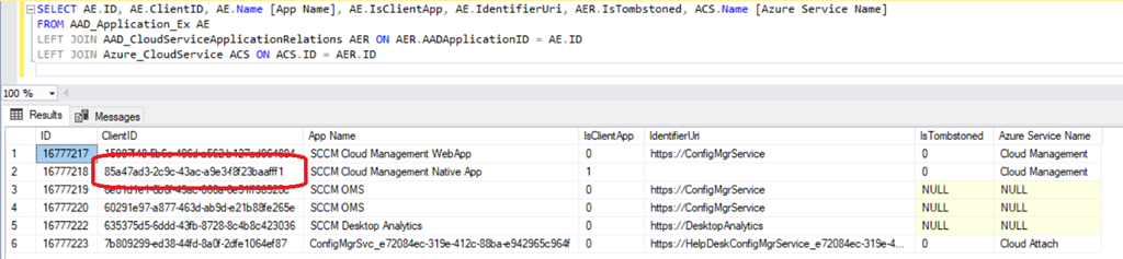 SELECT AE.ID, AE.ClientID, AE.Name [App Name], AE.IsClientApp, AE.IdentifierUri, AER.IsTombstoned, ACS.Name [Azure Service Name]