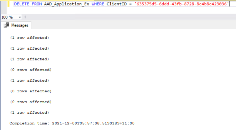 DELETE FROM AAD_Application_Ex WHERE ClientID = ‘<the ClientID value from the previous query’