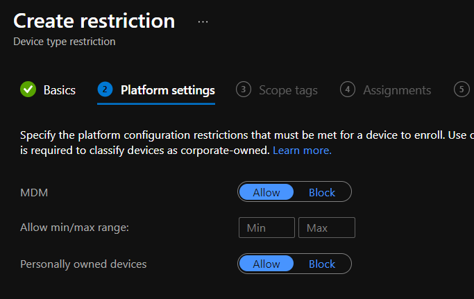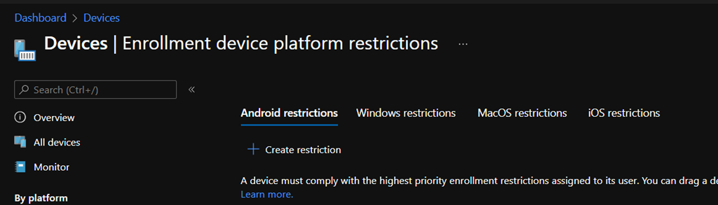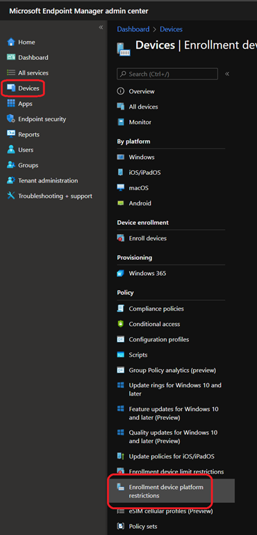 To implement this new capability, connect to your Intune portal (https://endpoint.microsoft.com/) and reach the Devices\Enrollment device platform restrictions blade