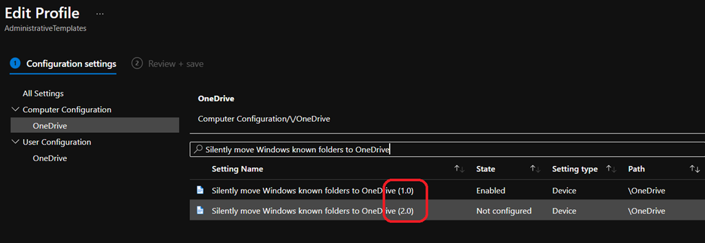 The ‘original’ setting is now called “Silently move Windows known folders to OneDrive (1.0)” and then one “Silently move Windows known folders to OneDrive (2.0)”.