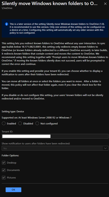 In addition, the new version allows you to define which Known Folder to be redirected, it automatically set the Tenant ID as well as if you want to show the notification that the folders have been redirected.