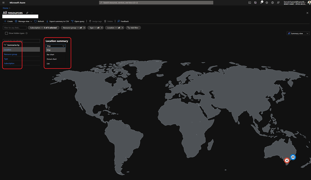 The Summary View allows you to view the location where your resources are deployed, by type of resources, resource group or subscription; this option depends from where you are viewing the resources (All Resources, resource group or resource type).