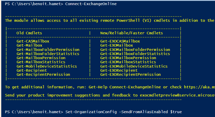 Set-OrganizationConfig –SendFromAliasEnabled $true
