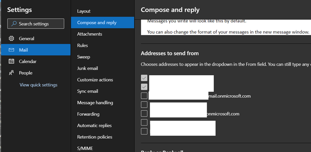 The option Addresses to send from is available under the Mail\Compose and reply section