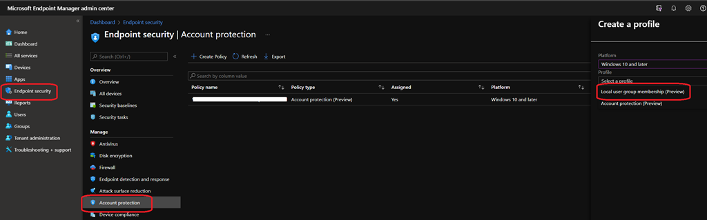 To start managing local groups memberships, connect to your Intune/Endpoint Configuration Manager portal (https://endpoint.microsoft.com/) and access the Endpoint Security\Account protection blade to create a new Account Protection configuration profile.