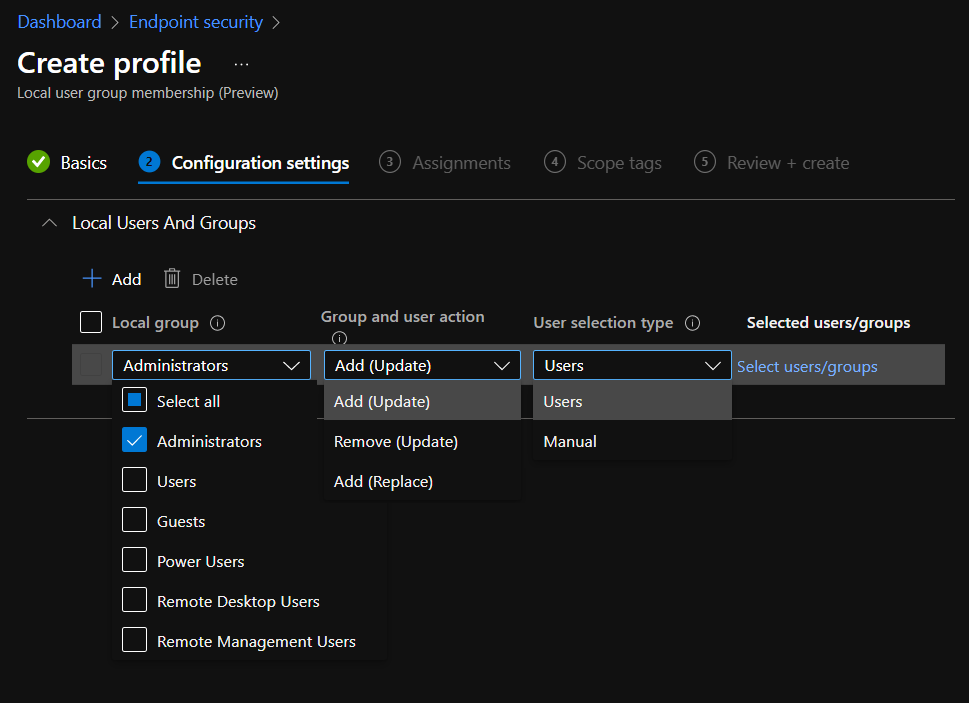There you can select one or more local group to manage and define the action between Add (update), Add (Replace) or Remove (Update)