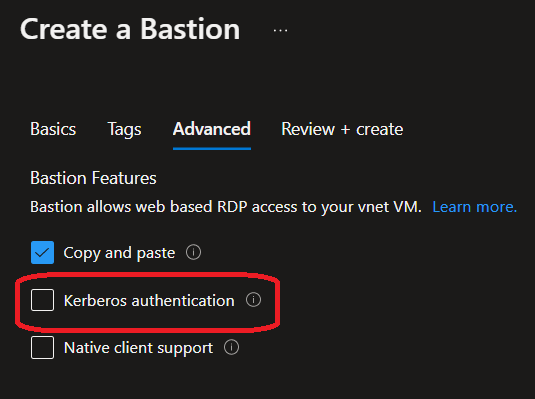 When creating a new Bastion host, the option to enable Kerberos is available in the Advanced tab