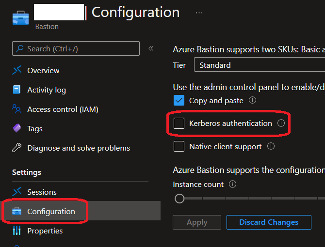 To update an existing Bastion, access the Bastion service blade and edit the Bastion host you want to configure for Kerberos authentication by accessing the Configuration blade