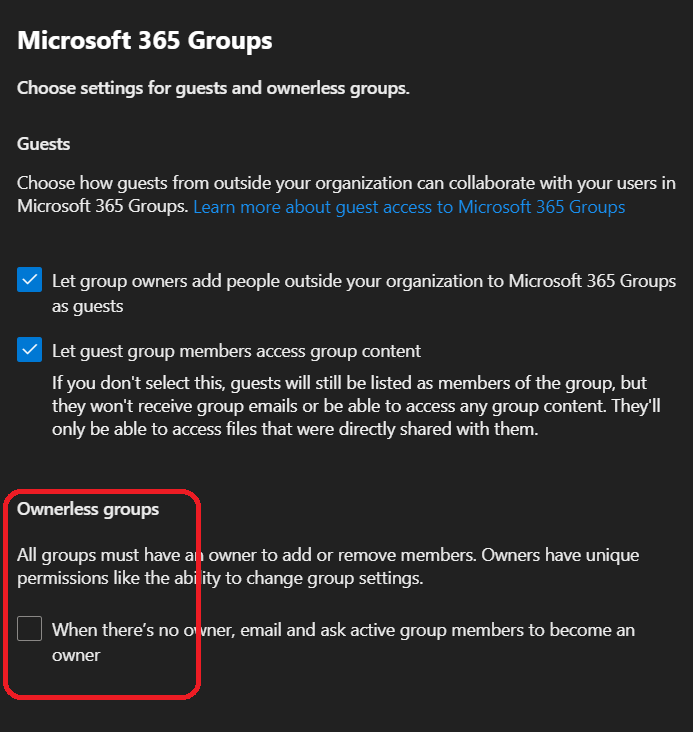 The Ownerless groups option allows you to define: