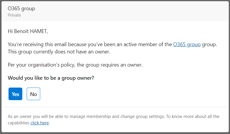 Identified users will then receive a notification like the below one to take or not ownership of the group