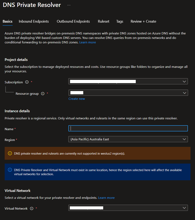 You now have to select the subscription, resource group, region where the private resolver will be deployed. You also have to select the virtual network which will use it.
