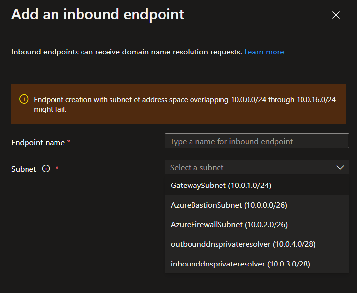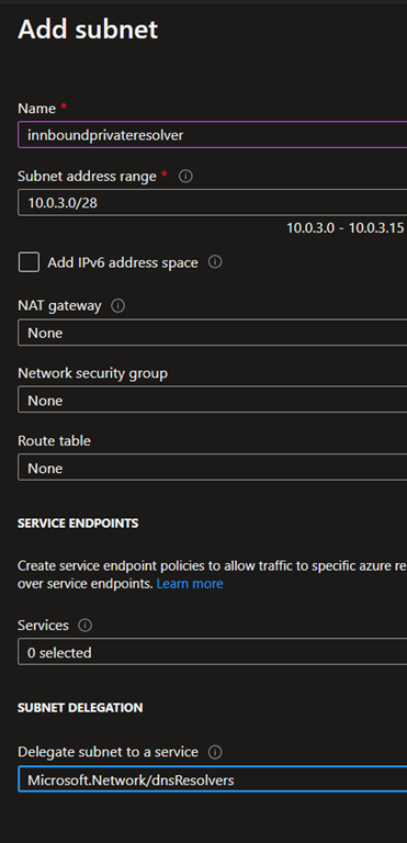 Then you need to create 2 new subnets in your virtual network; these subnets will be used later when creating the private resolver endpoints.