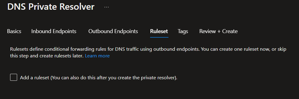The next step it create the rulesets to configure the conditional DNS forwarding; you can go straight if you want to create these later