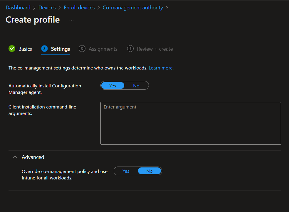 By accessing this new Co-management settings you can create a profile to deploy the SCCM client and configure it using your own custom parameters (similar to what you do with the SCCM console)