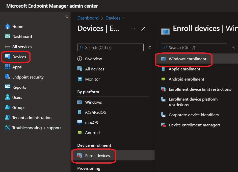 To do so, connect to your Intune portal (https://endpoint.microsoft.com/) and go to the Devices\Enroll devices\Windows enrollment blade