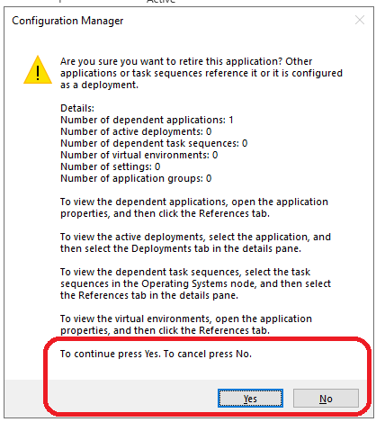 Well, good news, with SCCM Current Branch version 2203 now you can retire an application even if it has dependency.