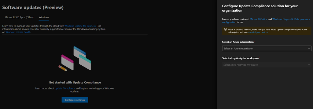 If you want to have the Windows update status you will need to have an Azure subscription with a Log Analytics available. This is needed to deploy and then use the Update Compliance solution.