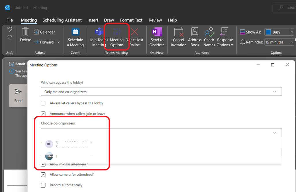 The option to define co-organizers is available from the meeting options page, which can be accessed directly from Outlook client