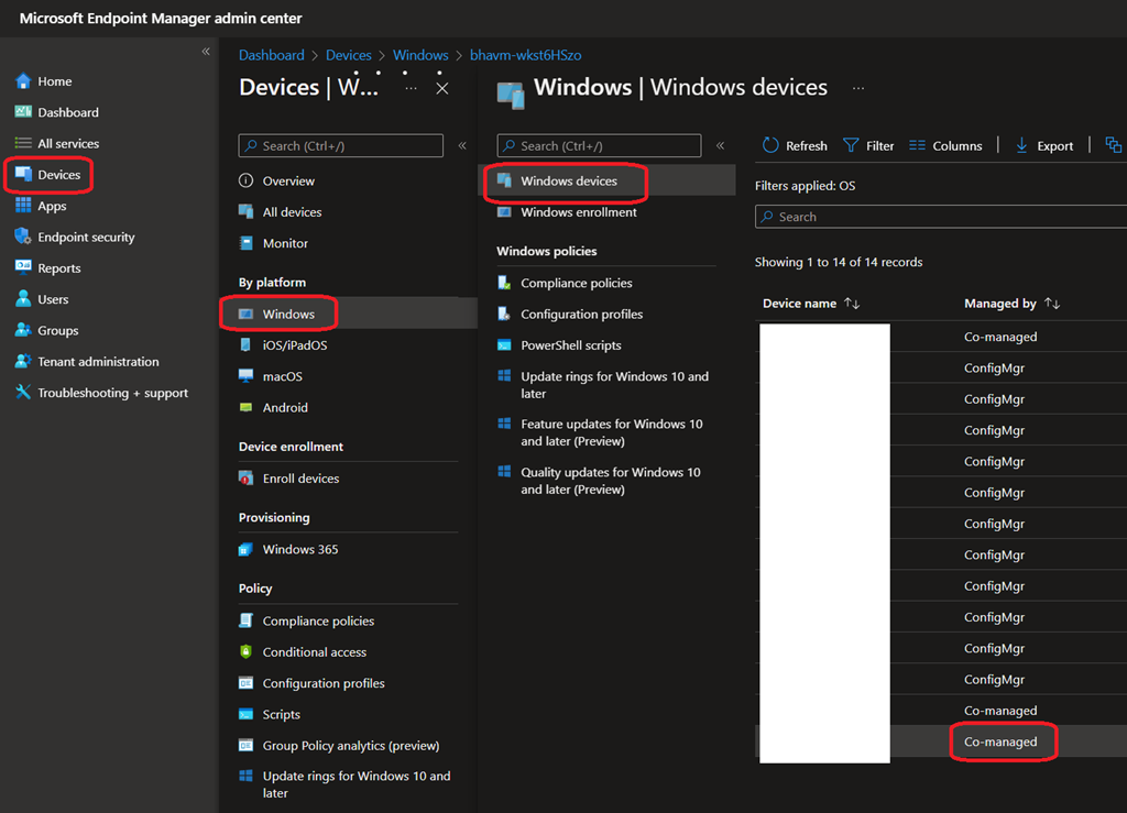 To have a look at it, connect to your Intune portal (https://endpoint.microsoft.com/) and access the Devices\Windows\Windows Devices blade to select one of the co-managed device.
