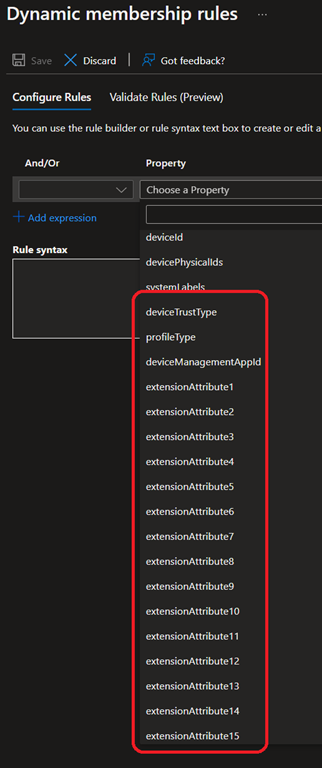 • deviceManagementAppId: defines the MDM application ID in Azure AD. If you use Intune, the Azure App ID is 0000000a-0000-0000-c000-000000000000, making the membership rule looking like this device.deviceManagementAppId -eq “0000000a-0000-0000-c000-000000000000”. For SCCM co-management it should be 54b943f8-d761-4f8d-951e-9cea1846db5a