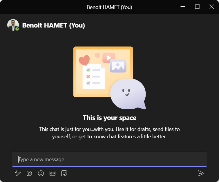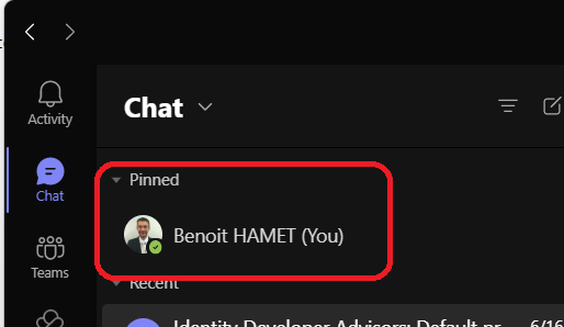 Also you may notice when accessing the Chat section you already have your personal space pinned on top; if this is the case you don’t need off course to do the above steps